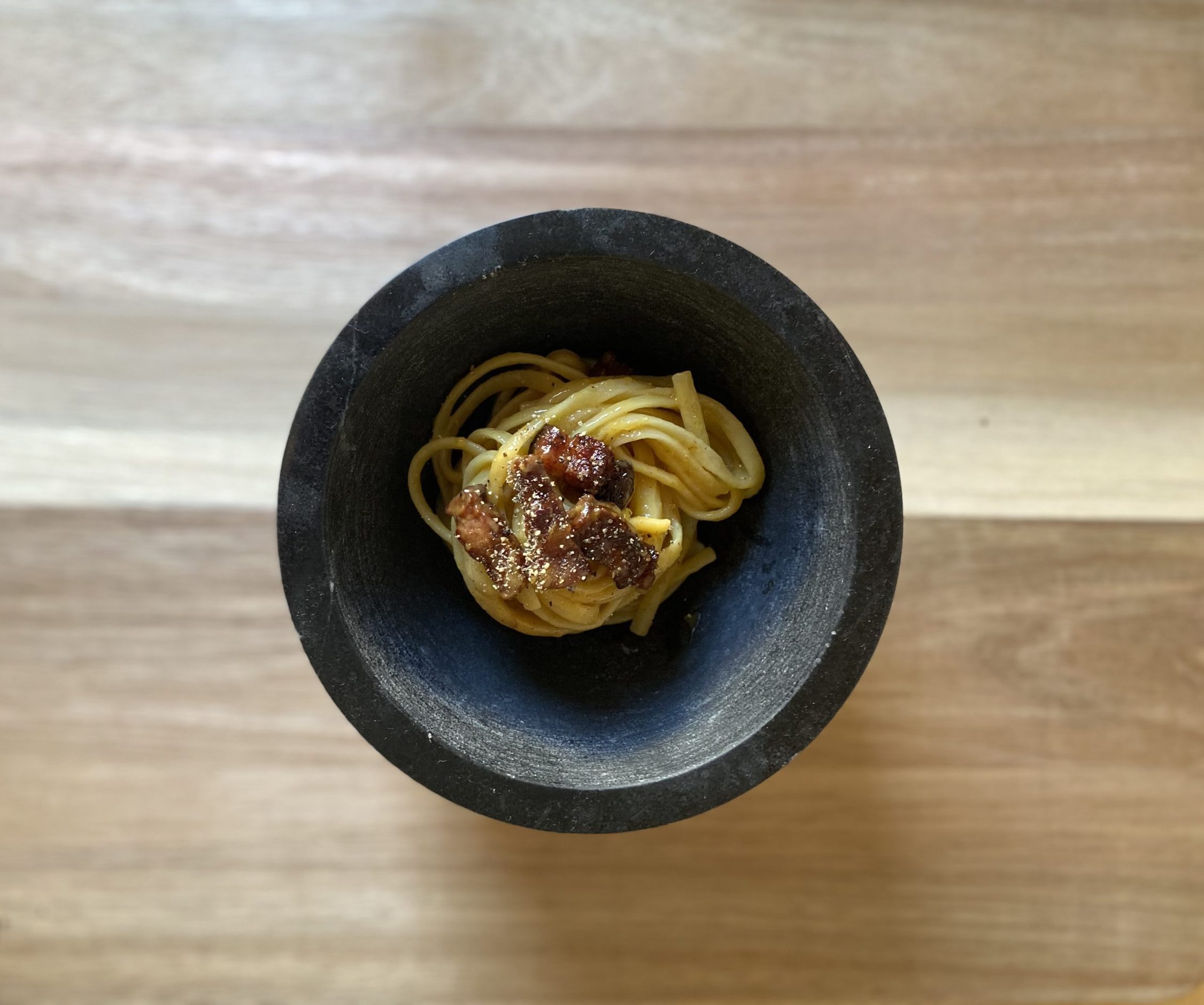 - Spaghetti etwa 1 Minute bevor sie aldente sind vom Wasser direkt in die Soße geben. Ebenfalls eine kleine Kelle Pastawasser dazugeben und über einem Wasserbad (z.B. dem restlichen Nudelwasser) vermengen, bis die gewünschte "schlotzige" Konsistenz erreicht ist